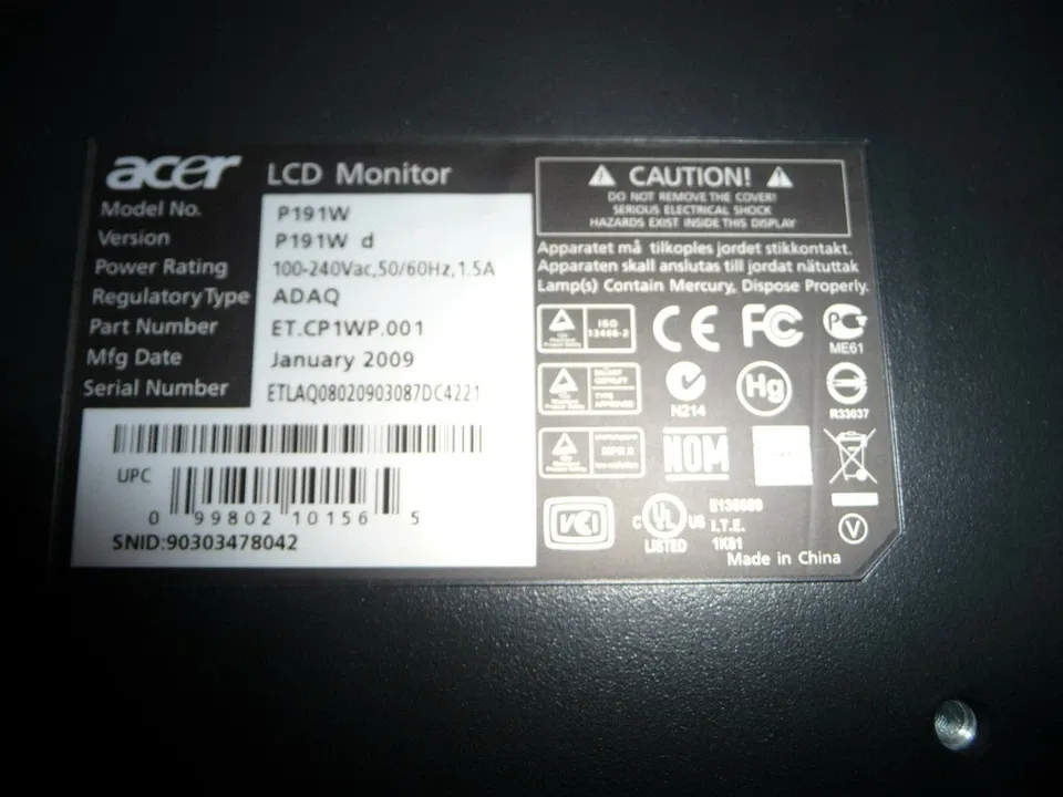 Acer P191WX Widescreen 19 Inch LCD Monitor ETCP1WP.001 Black VGA Very Good 3E